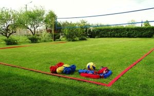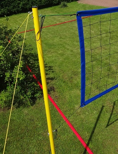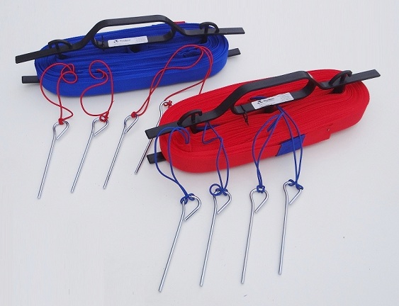 - Линии, прикрепленные к земле с помощью штифтов, прикрепленных к резиновым нарезкам на каждом углу: линии наматываются на намоточный механизм для облегчения намотки и хранения линий.